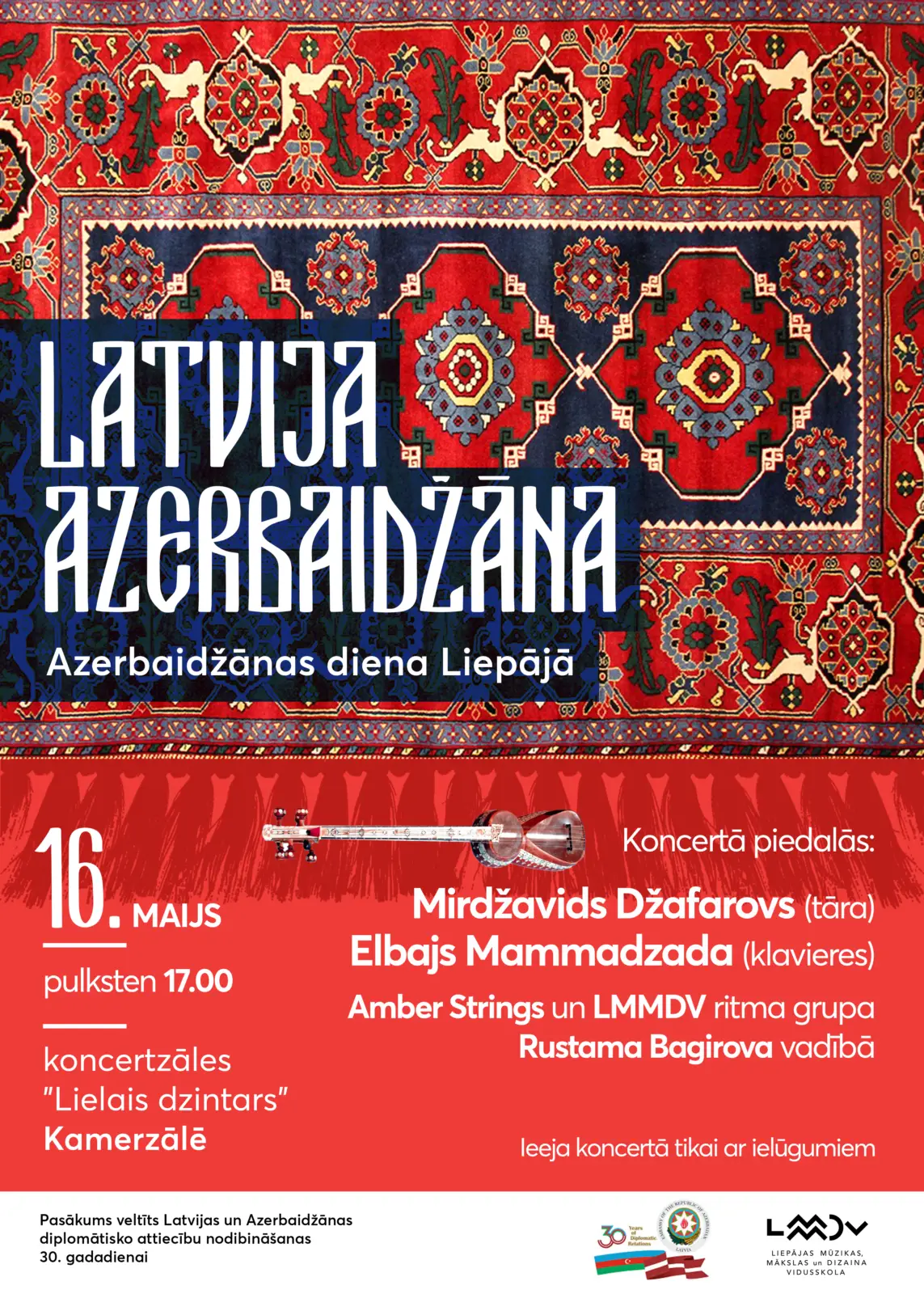 Liepājas Mūzikas, mākslas un dizaina vidusskola sadarbībā ar Azerbaidžānas vēstniecību Latvijā ceturtdien, 16. maijā, organizēs Azerbaidžānas dienu Liepājā. Pasākuma ietvaros pulksten 17.00 koncertzāles "Lielais dzintars" Kamerzālē notiks svētku koncerts un fotoizstāde. Azerbaidžānas vēstniecības, publiskās akciju sabiedrības "Azerkhalcha" un Liepājas interjera muzeja kopprojekta ietvaros notiks īpaši ar rokām austa Azerkhalch paklāja dāvināšanas ceremonija Liepājas interjera muzejam.